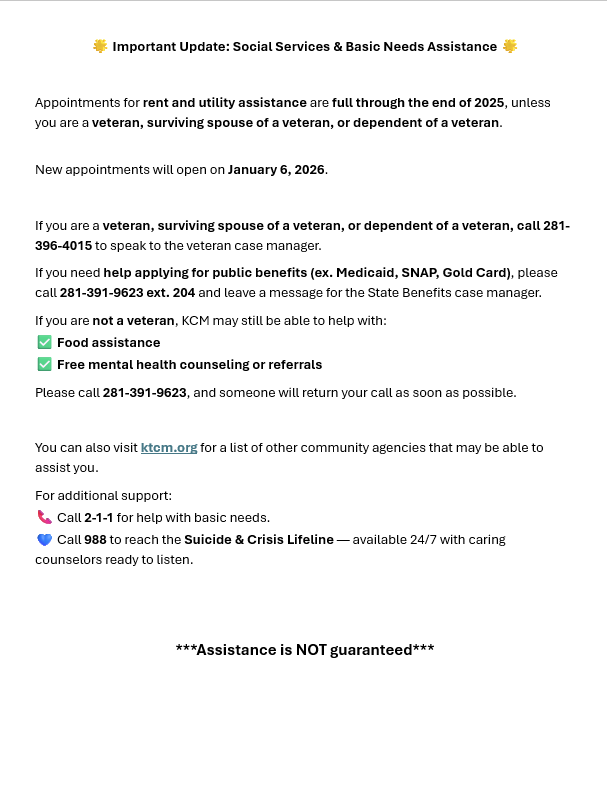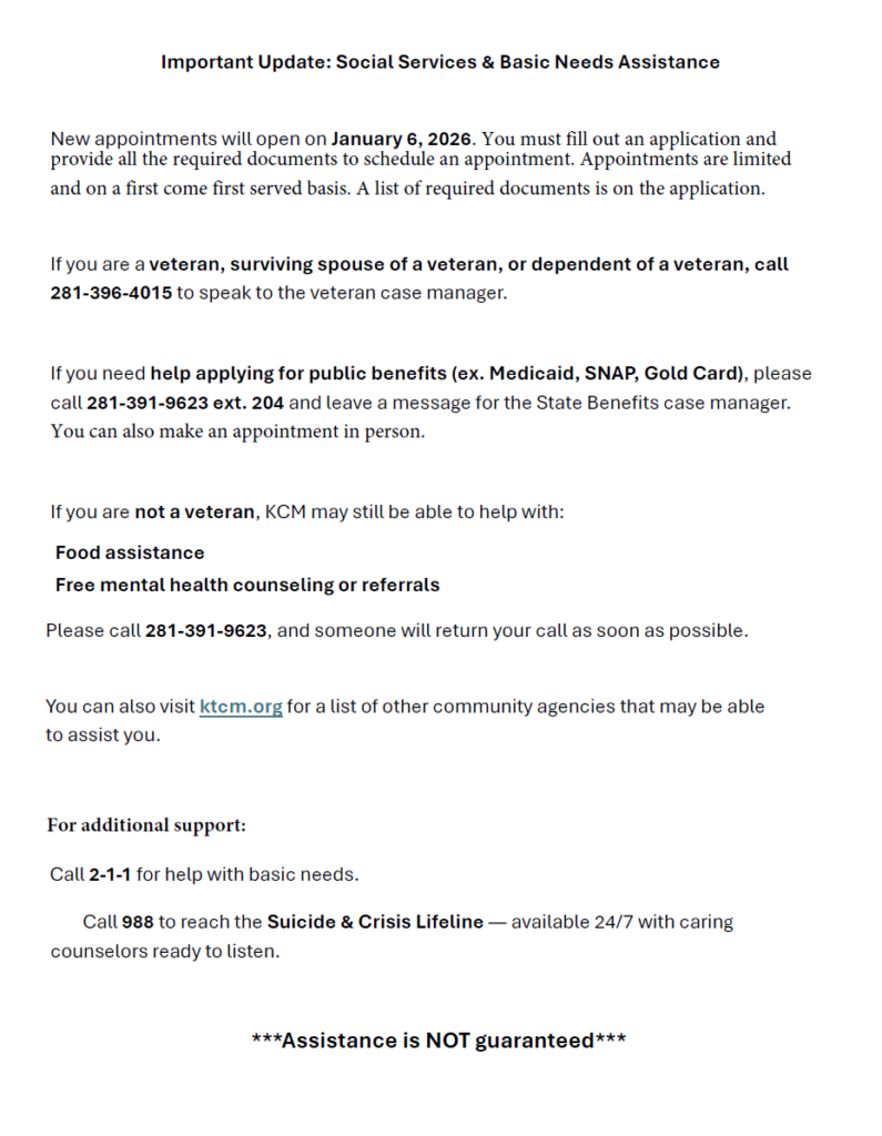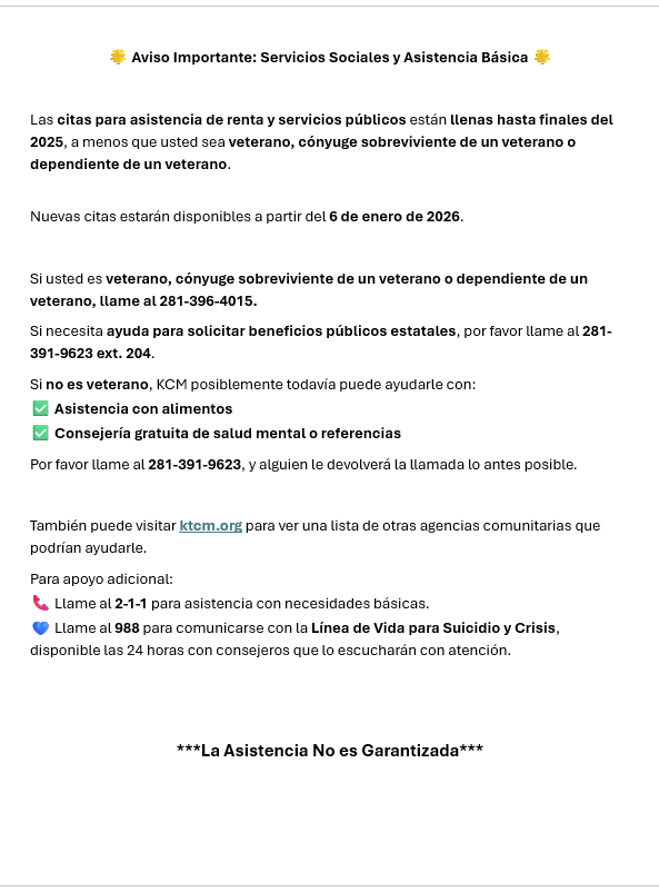 NOTE: KCM can provide Financial Assistance for those in Fort Bend and Harris counties within our zip code range. (see below)